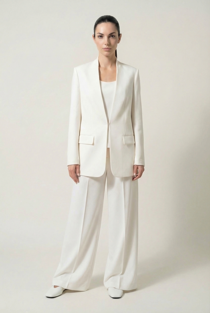 Брюки из костюмной поливискозной ткани прямые от линии бедра, с боковыми карманами по передних частях, с имитацией кармана в листочку на задних частях. Пояс притачной со шлевками. Брюки с заутюженными стрелками.