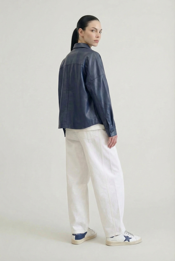 Жакет из экокожи в форме рубашки, на отлетной подкладке, со спущенной линией  плеча, с рубашечным воротником на отрезной стойке.