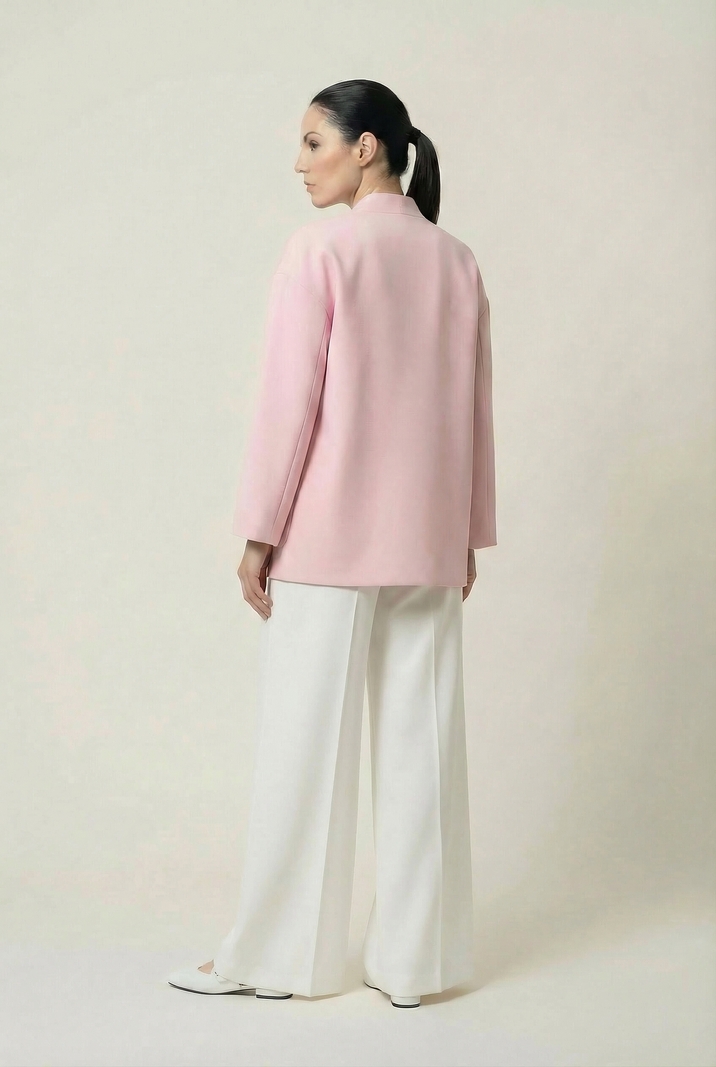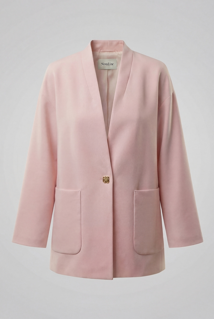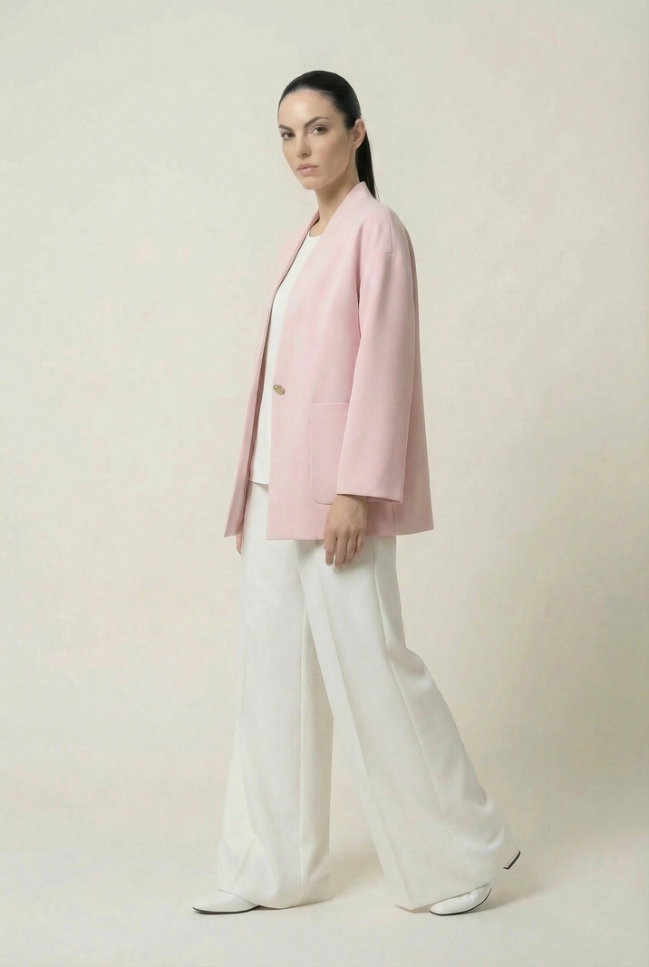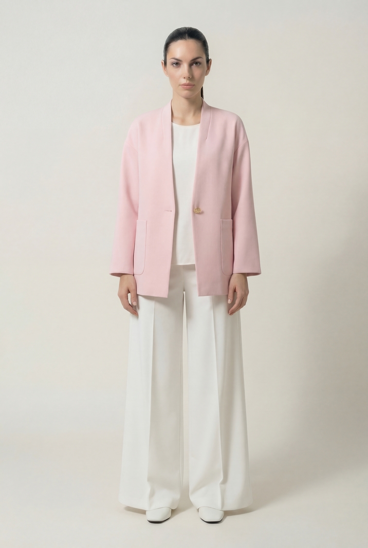 Жакет прямого силуэта из костюмной ткани, с застежкой на одну пуговицу, со спущенной линией плеча. V- образный вырез горловины, переходящий в воротник-стойку по спинке. Перед с накладными карманами. Жакет на подкладке.